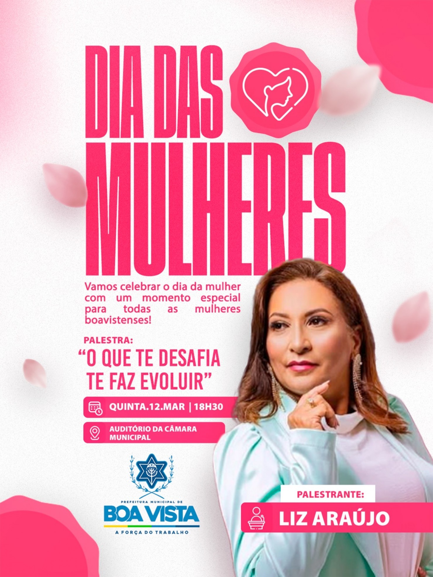 A Prefeitura Municipal de Boa Vista realizará, na próxima quinta-feira (12), às 18h30, no auditório da Câmara Municipal, uma programação especial em comemoração ao Dia Internacional da Mulher.
