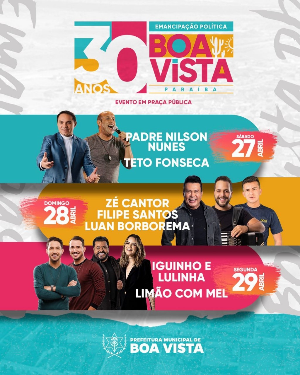 No sábado à noite, em praça pública, ocorrerá show religioso com Teto Fonseca e o Padre Nilson Nunes. Já no domingo, a festa fica por conta de Zé Cantor, Filipe Santos e Luan Borborema. E na segunda-feira, 29, feriado municipal pelo aniversário da cidade, haverá apresentações de Iguinho e Lulinha e show de Limão com Mel.