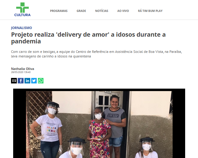 Leia na íntegra a reportagem da jornalista Nathalia Oliva publicada no site da TV Cultura: https://tvcultura.com.br/noticias/8225_projeto-realiza-delivery-de-amor-a-idosos-durante-a-pandemia.html